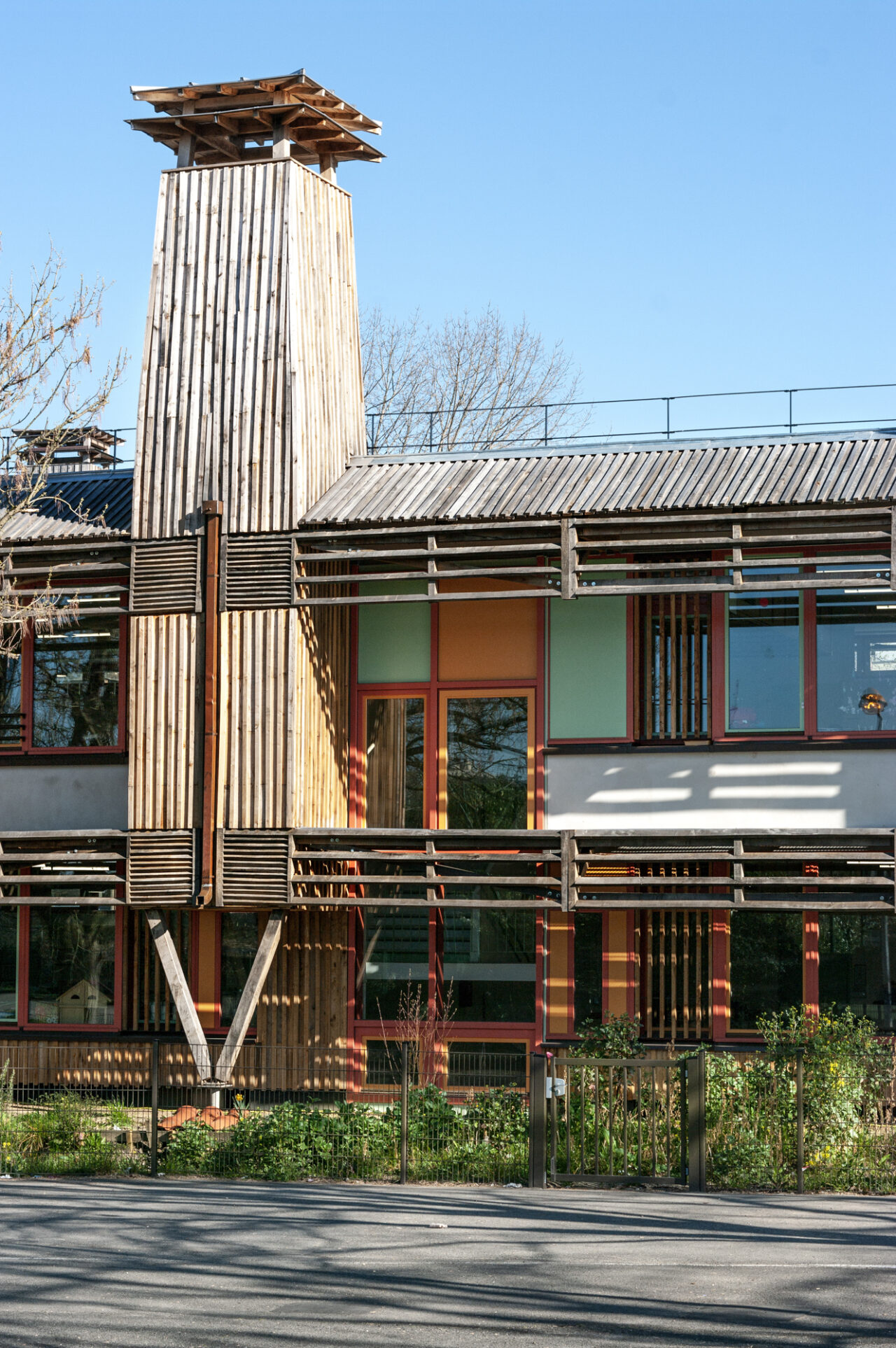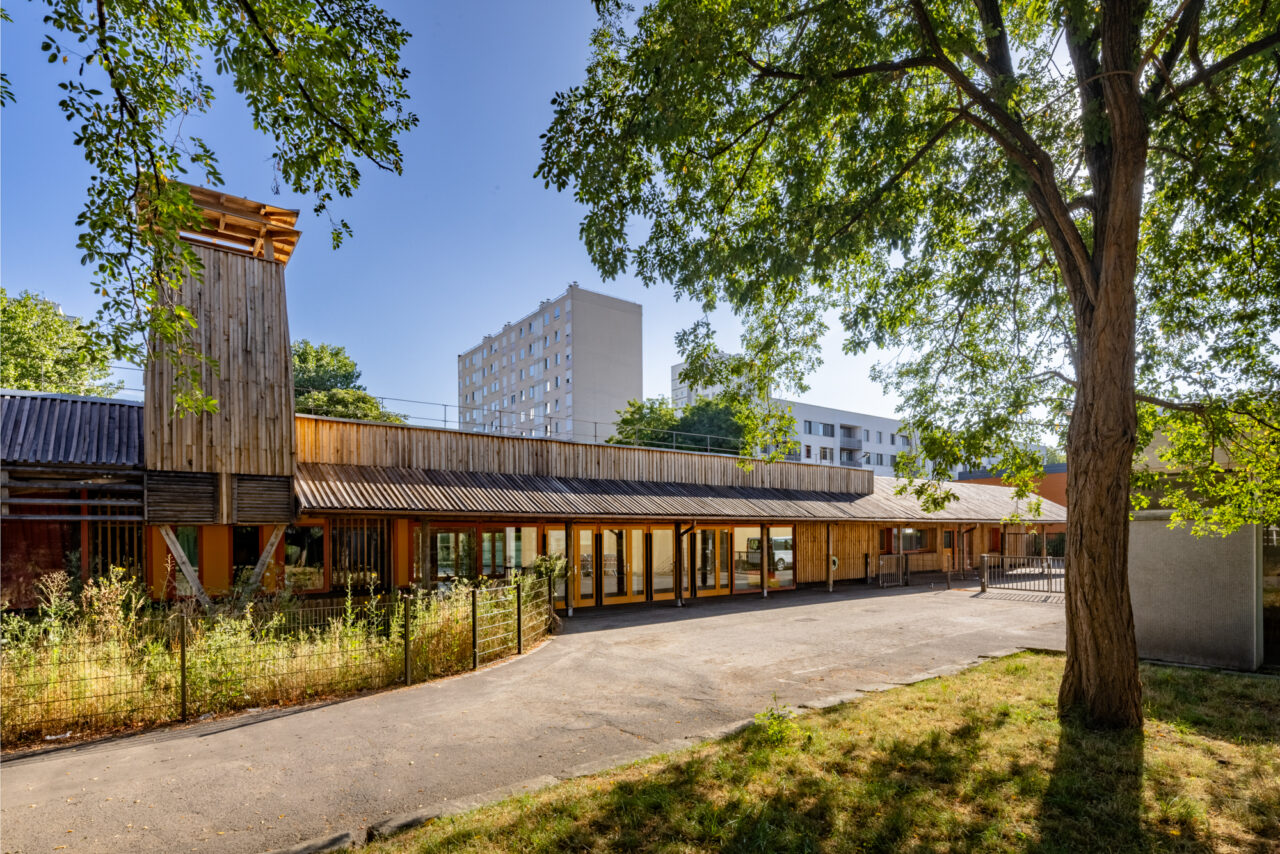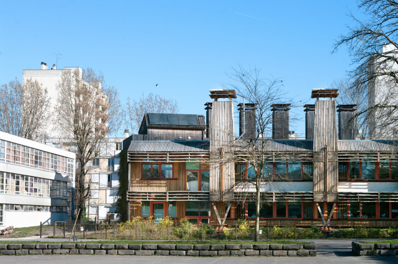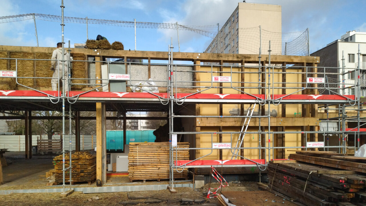 comment Structure autoportante poteaux-poutres en bois massif, feuillu et local, fondée sur pieux vissés métalliques pour ne pas ajouter de poids sur l’existant | Ossature secondaire : Réutilisation de solives issues de la déconstruction du plancher d’un lycée à Poitiers | Isolation par l’extérieur : bottes de paille de Thinopyrum intermedium et paille de blé, complément en coton recyclé | Enduit extérieur : chaux-sable | Bardage : châtaignier non traité | Auvent et brise-soleil : bois massif francilien en circuit court issu de la sylviculture douce | Isolation de la toiture et du soubassement : verre cellulaire (issu du recyclage) | Cloisons neuves : ossature bois, isolant coton recyclé ou faux-plafonds acoustiques réutilisés, plaques fibres-gypse | Ventilation naturelle avec récupération de chaleur à commande manuelle | Chauffage urbain par géothermie avec poêle de masse en complément | Récupération de l’eau de pluie sur site et potabilisation.