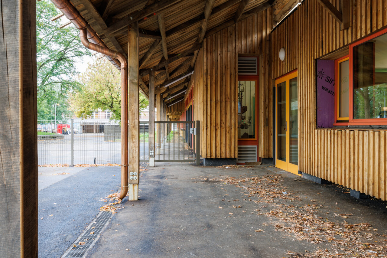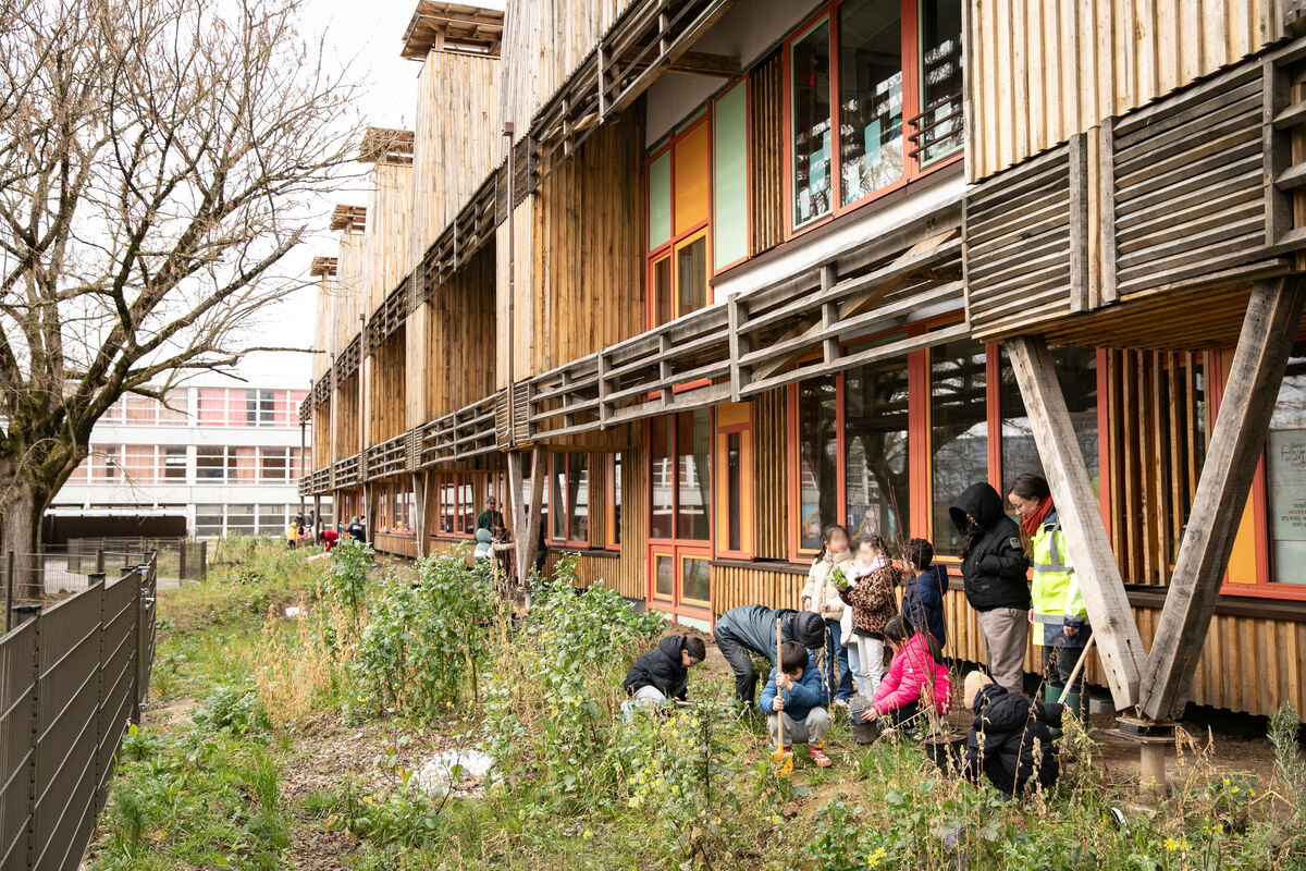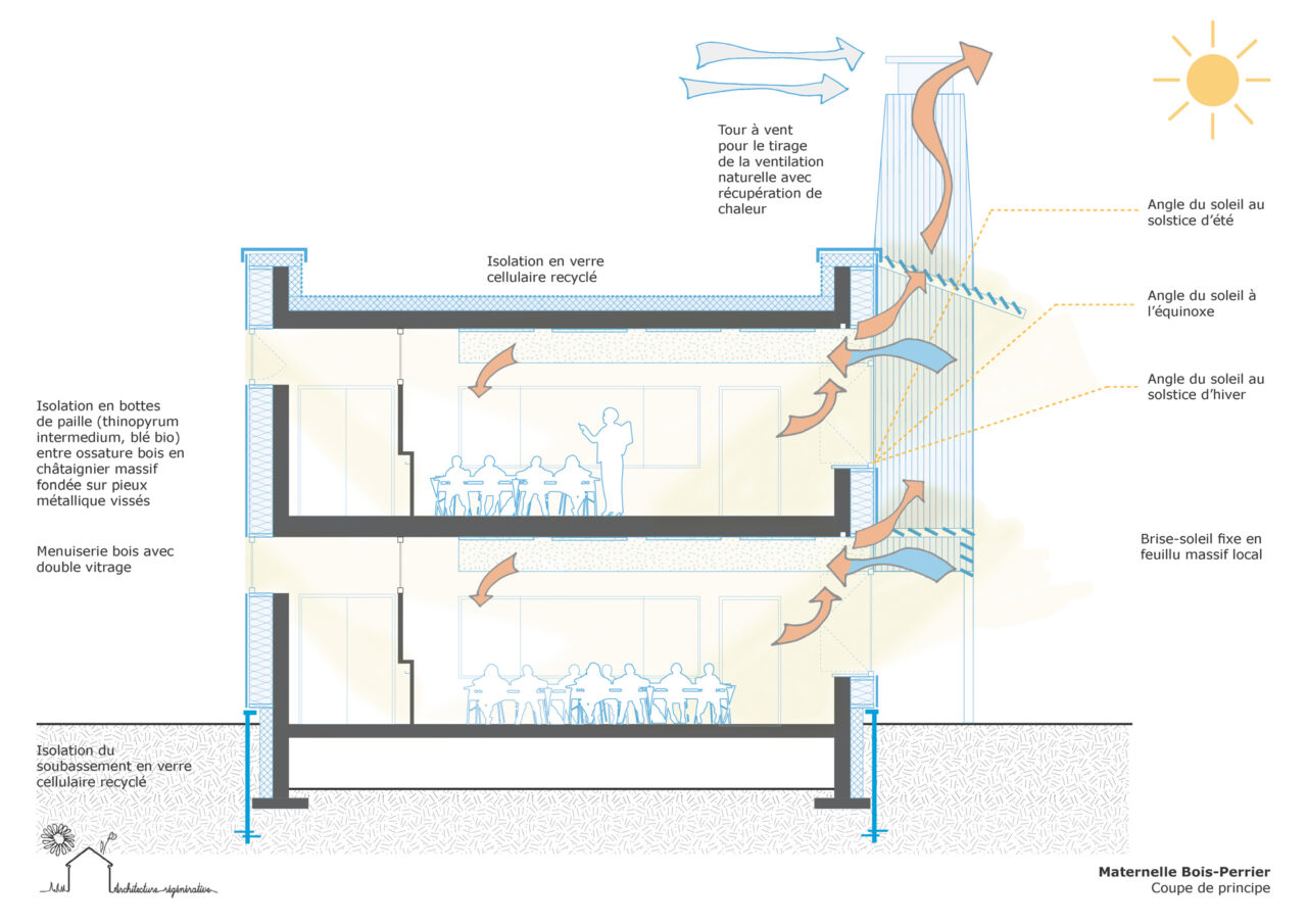 Pour répondre à toutes ces attentes, les matériaux sont sourcés pour favoriser le développement de filières locales participant à la régénération des écosystèmes (sylviculture douce, agriculture bio, céréales pérennes). La ventilation naturelle des pièces principales fonctionne sans électricité, un poêle de masse à bûches procure une source autonome en chauffage de chauffage, l’eau de pluie est retenue sur site par des noues paysagères, une réserve de 30 000 litres est stockée pour l’arrosage, les chasses d’eau des sanitaires adultes et potabilisée pour des jeux d’eau extérieurs, les réseaux sont laissés apparents pour en faciliter la maintenance...
