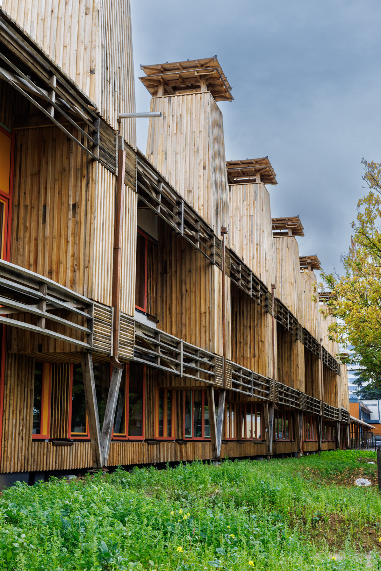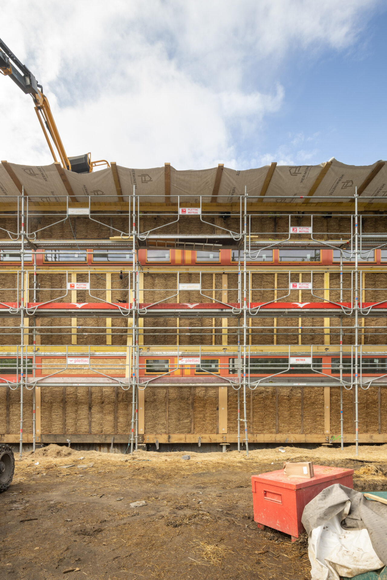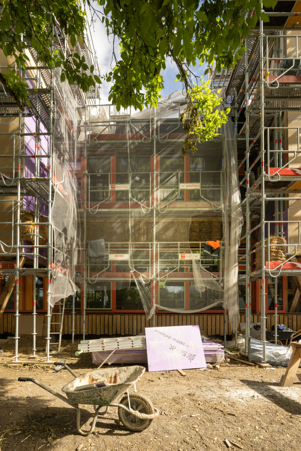 La préfabrication est souvent de mise pour ce type de projet qui plus est dans un temps de chantier relativement court de 18 mois. Or la structure bois est taillée à pied d’œuvre, les bottes sont insérées, enduites ou bardées sur chantier. Pourquoi ce choix ? Comment avez-vous organisé le chantier pour tenir le calendrier ?