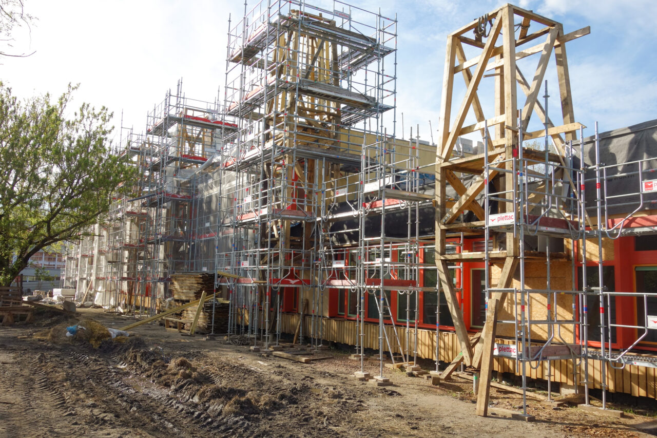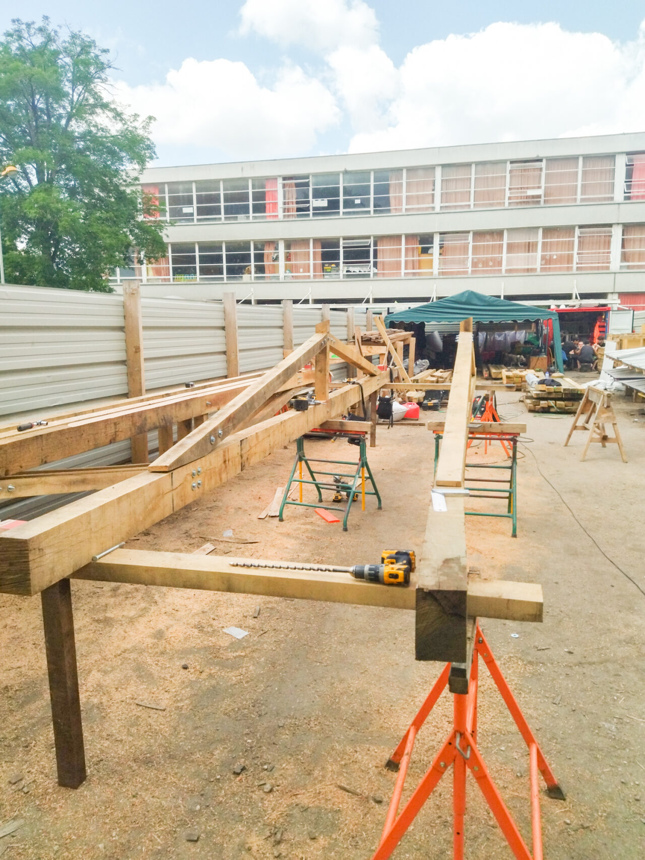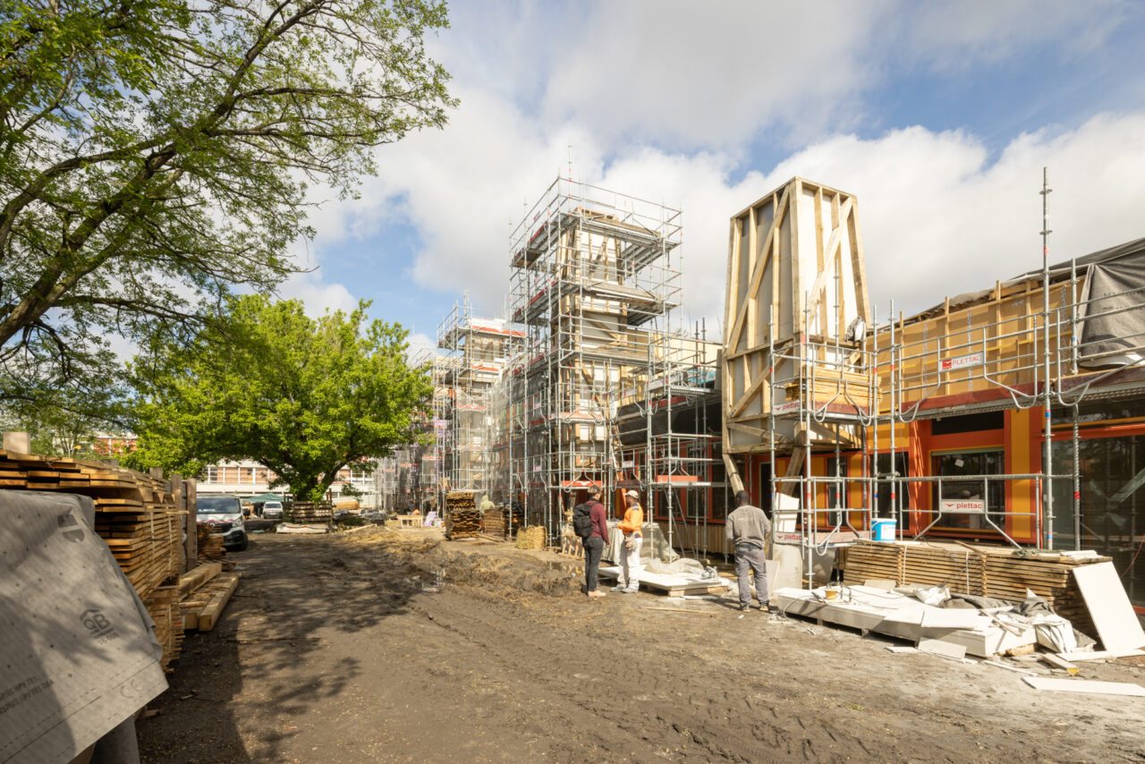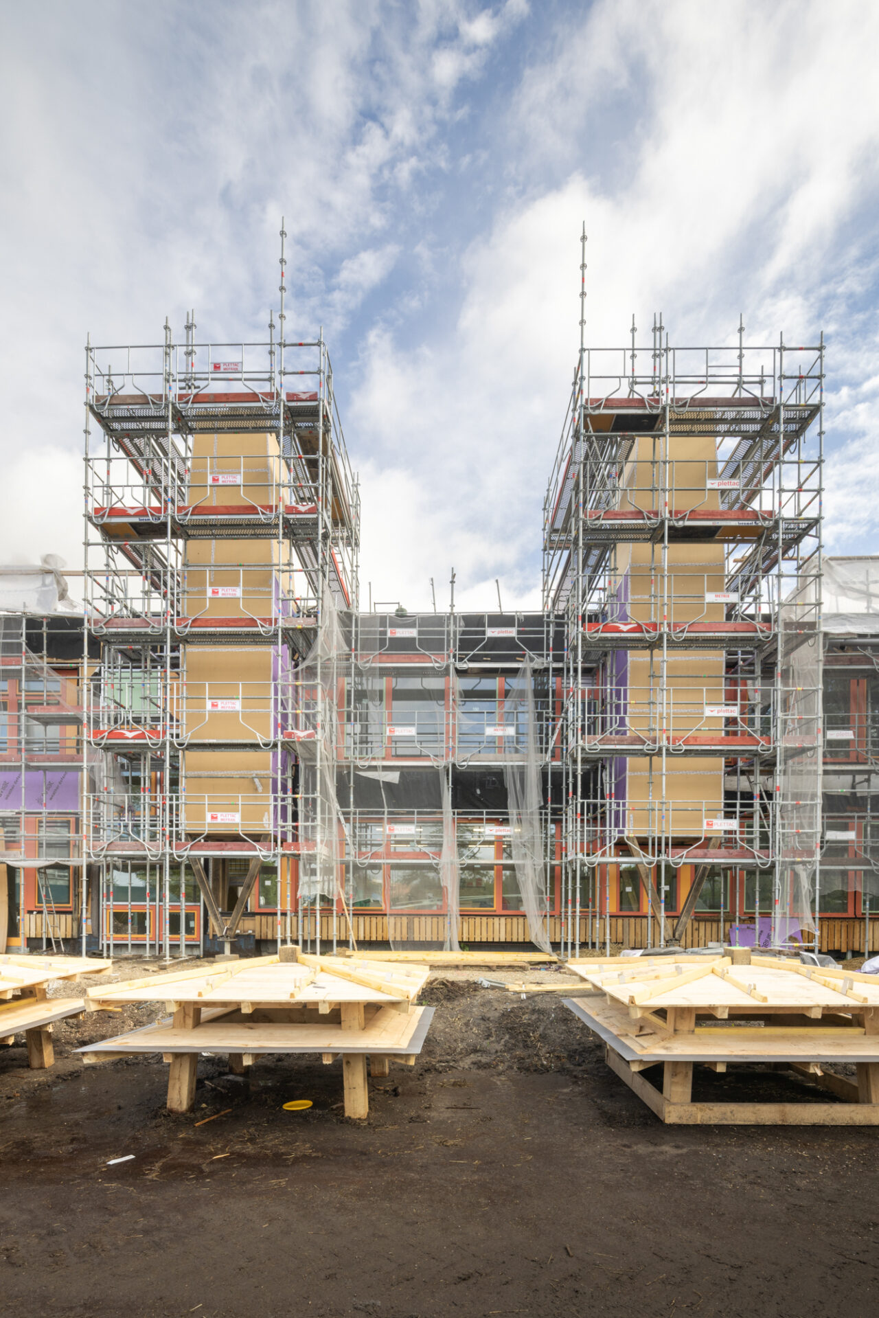 La préfabrication est souvent de mise pour ce type de projet qui plus est dans un temps de chantier relativement court de 18 mois. Or la structure bois est taillée à pied d’œuvre, les bottes sont insérées, enduites ou bardées sur chantier. Pourquoi ce choix ? Comment avez-vous organisé le chantier pour tenir le calendrier ?