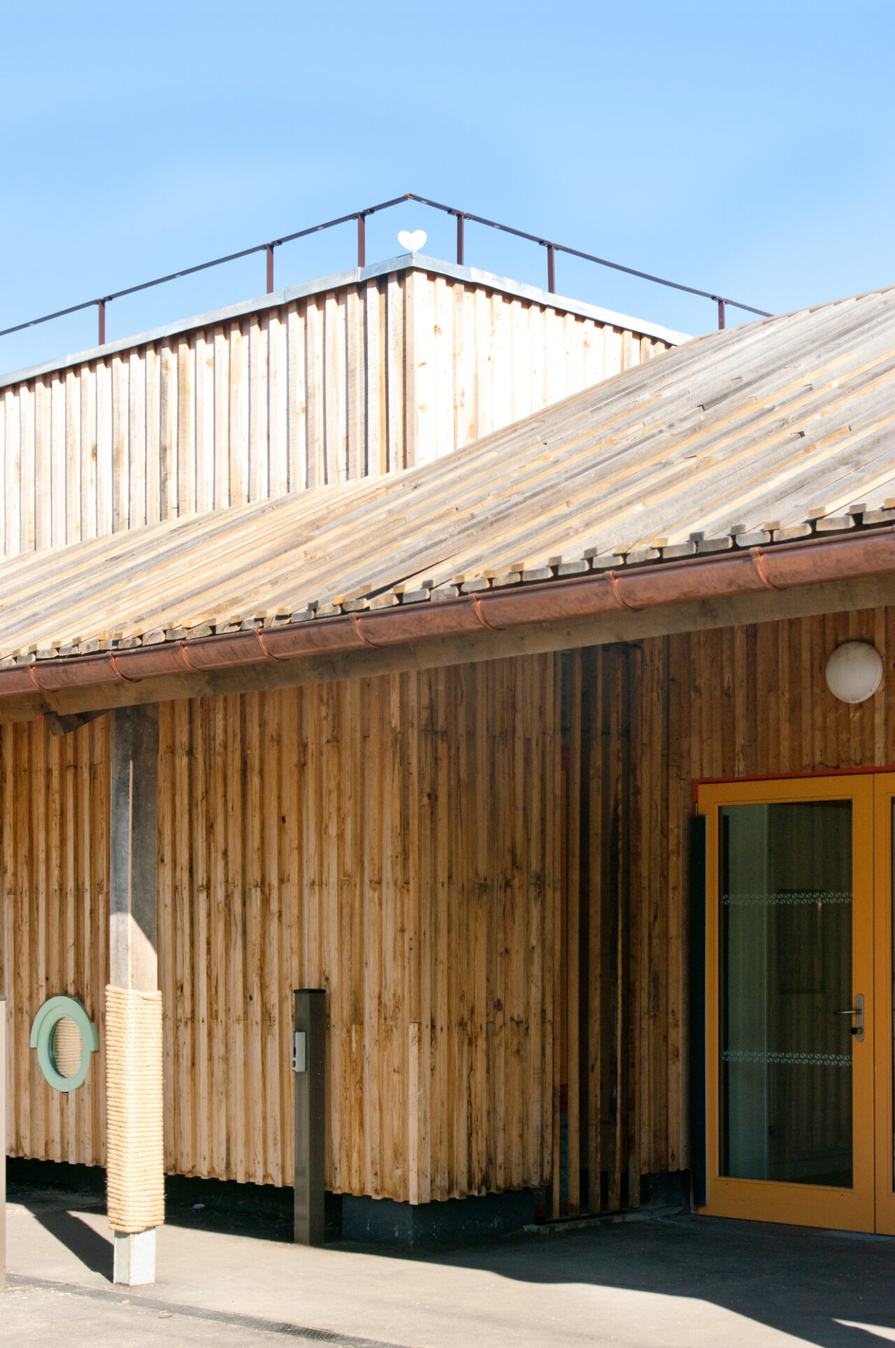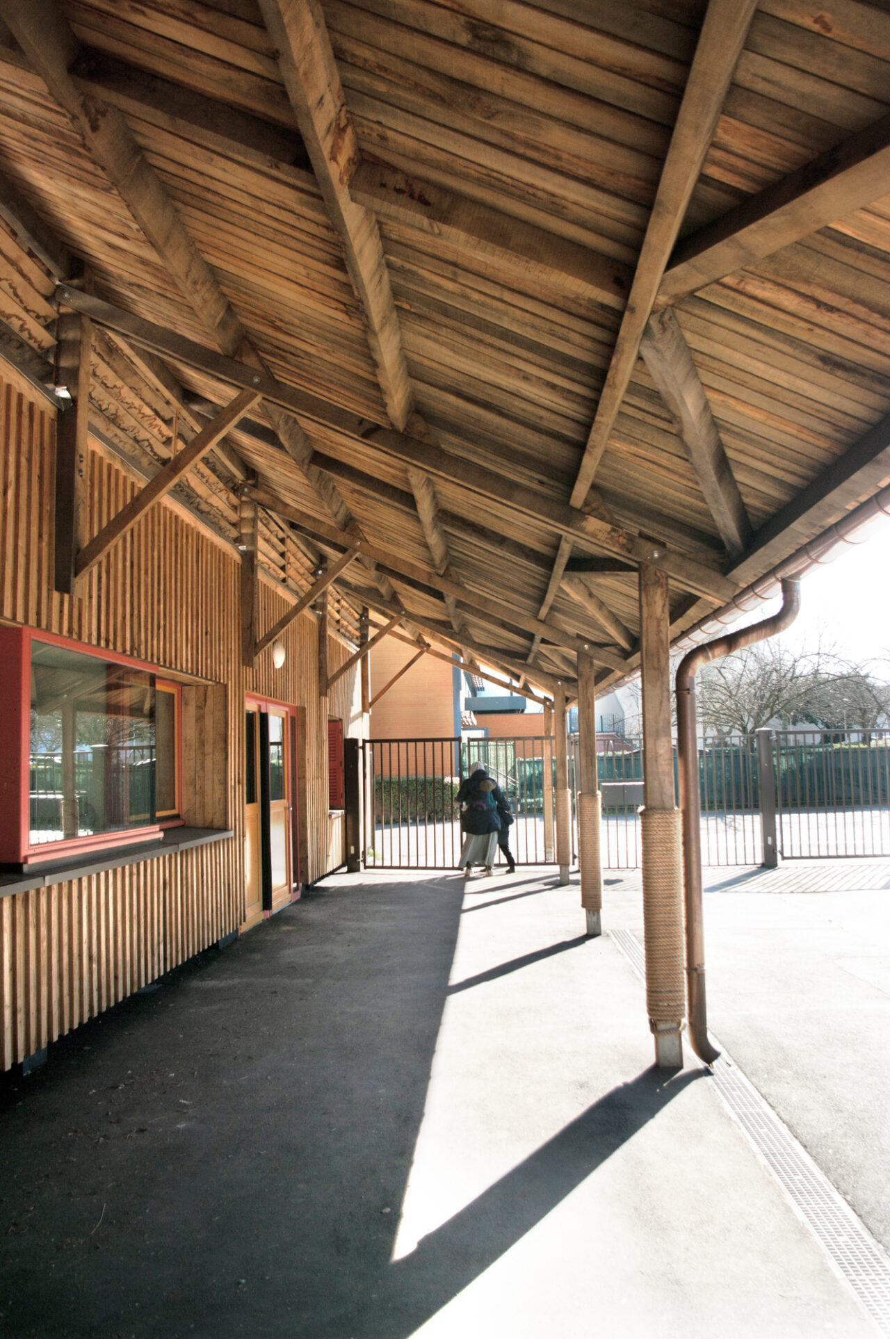 Le soleil étant haut dans le ciel lorsqu’il se trouve au sud, l’installation d’une protection solaire fixe horizontale et large au-dessus des fenêtres nous a semblé être la protection la plus adaptée. En effet, nous avons régulièrement des problèmes avec les brise-soleils orientables installés sur les autres établissements avec lesquels les enfants jouent et qui finissent par casser.