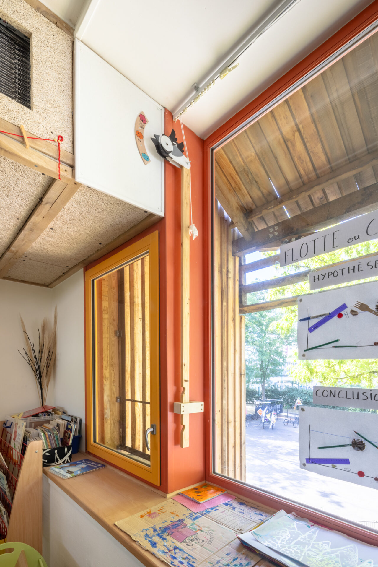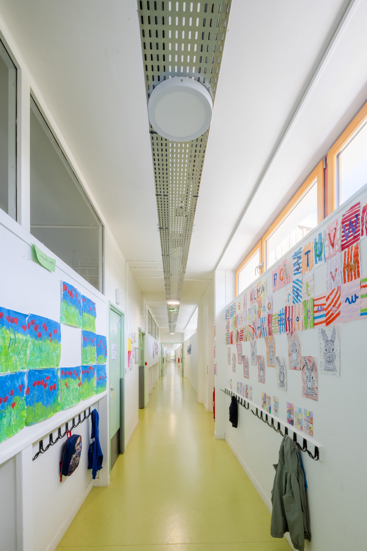 De plus, bien que nous n’ayons pas pu agrandir les salles de classe, l’épaisseur de la façade nous a permis, en mettant les fenêtres au nu extérieur de l’enveloppe, d’agrandir le volume et d’offrir de grandes tablettes intérieures que les enseignant·e·s utilisent pour poser du matériel.