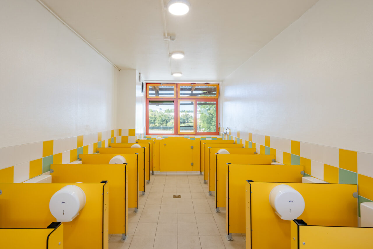 Le bâtiment a tout de même fait l’objet de plusieurs transformations pour l’adapter à de nouvelles pratiques. Dans les classes, des points d’eau avec auges ont été installés pour les activités de peinture et il nous a été demandé de mettre en place des postes informatiques pour permettre la réversibilité entre classe maternelle et élémentaire où l’usage de tableaux numériques s’est généralisé (bien qu’au regard de toutes les études scientifiques sur le sujet nous ne soyons pas favorables à l’utilisation des écrans auprès des enfants). Dans les sanitaires, beaucoup de parents se plaignaient que la pudeur empêchait leurs enfants d’aller aux toilettes, nous avons expérimenté des cabines fermées, à hauteur d’enfant, pour les grandes sections (à noter que depuis, le personnel de l’école nous a demandé d’enlever les portes des cabines car ce n'était pas pratique lorsque les ATSEM doivent les aider). Le réaménagement le plus conséquent a concerné les espaces d’accueil qui n’étaient plus adaptés à leurs fonctions. En effet, le hall, la loge et le bureau de direction étaient placés à l’opposé de l’accès à l’établissement, sans visibilité sur l’entrée, et les locaux du personnel, trop petits, ont été agrandis.