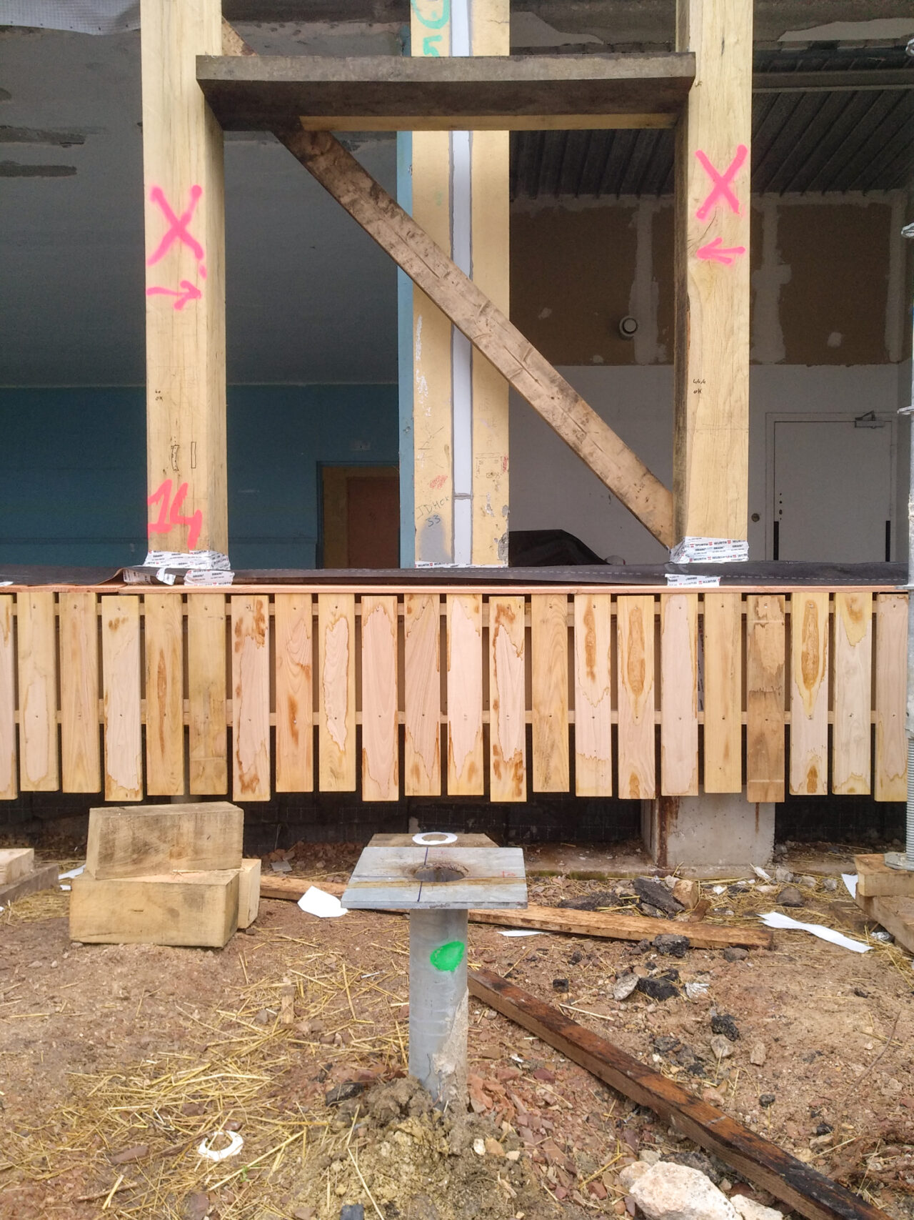 Pour éviter les semelles des fondations existantes, les pieux ont été déportés de la façade jusqu’à 30-40cm. Et pour que la charge de l’enveloppe soit placée au droit des pieux, il a fallu que la superstructure soit déportée d’autant, ce qui nous a convaincus de faire une isolation en botte de paille posée à champs sur 47 cm d’épaisseur et portée par une structure poteau-poutre en bois. La paille est alors posée directement contre la façade existante en béton qui joue le rôle de pare-vapeur. La façade est ensuite finie par un enduit chaux-sable sur la paille ou par un panneau en fibre de bois dense faisant pare-pluie derrière un bardage.
