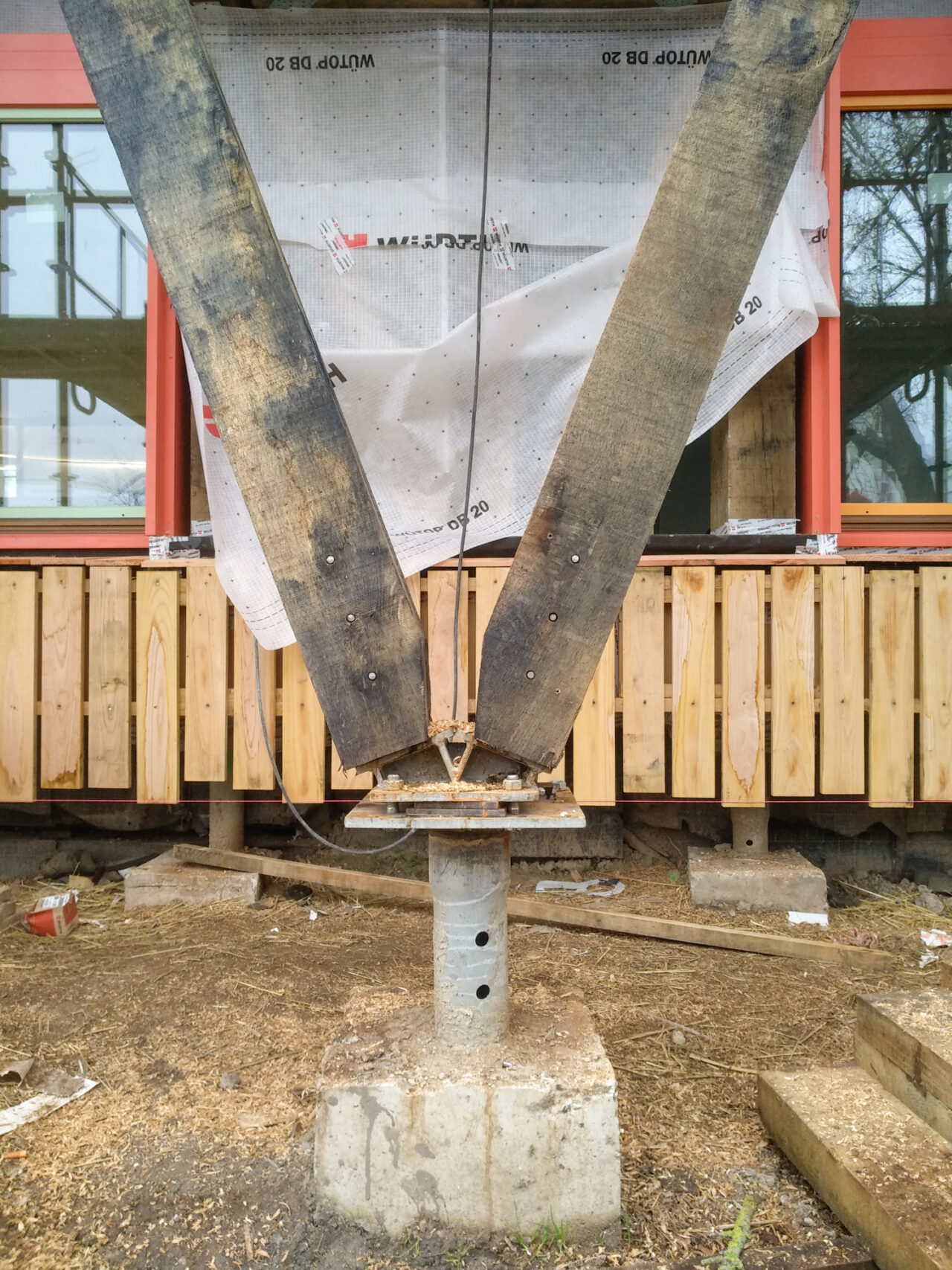 À partir de là, il a été clair pour nous que la solution la plus sobre serait de fonder l’enveloppe isolante sur une fondation à part entière. Nous avions d’abord envisagé une fondation cyclopéenne (pierre chaux) accolée à celle existante ou des pieux bois pré-foncés, mais nous avions du mal à évaluer auprès du géotechnicien l’impact que cela pourrait avoir sur la stabilité structurelle du bâtiment. Nous nous sommes alors dirigés vers des pieux vissés métalliques, une solution ponctuelle, réversible, recyclable et plutôt low-tech, bien que l’acier requiert une grande quantité d’énergie à sa fabrication (et que nous avons dû en implanter près de 100 !).