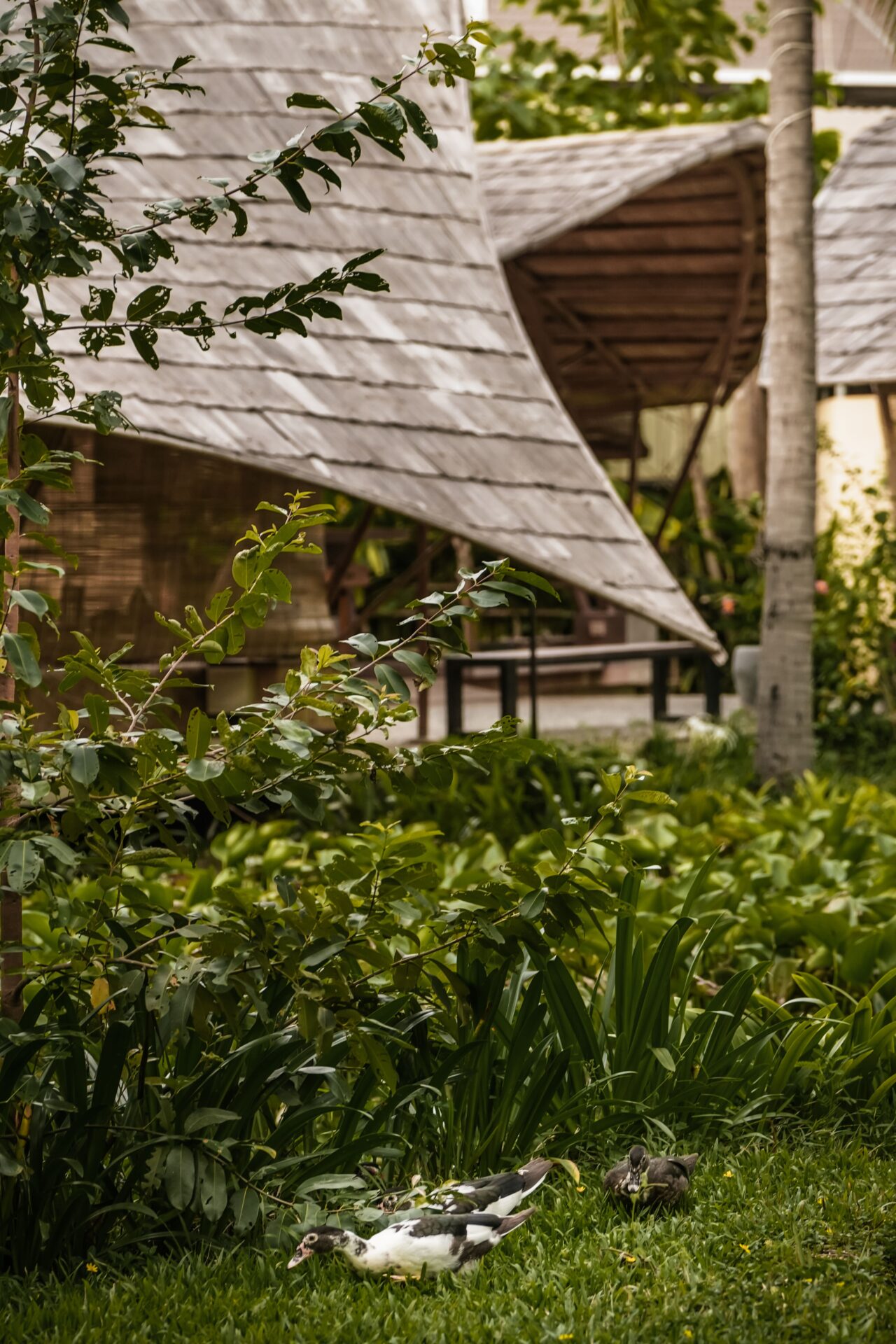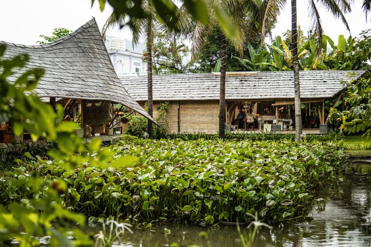 Sol et eau cohabitent harmonieusement, tandis que les constructions « aériennes » forment un subtil mille-feuille : terre – eau – végétation – air – béton – bambou.