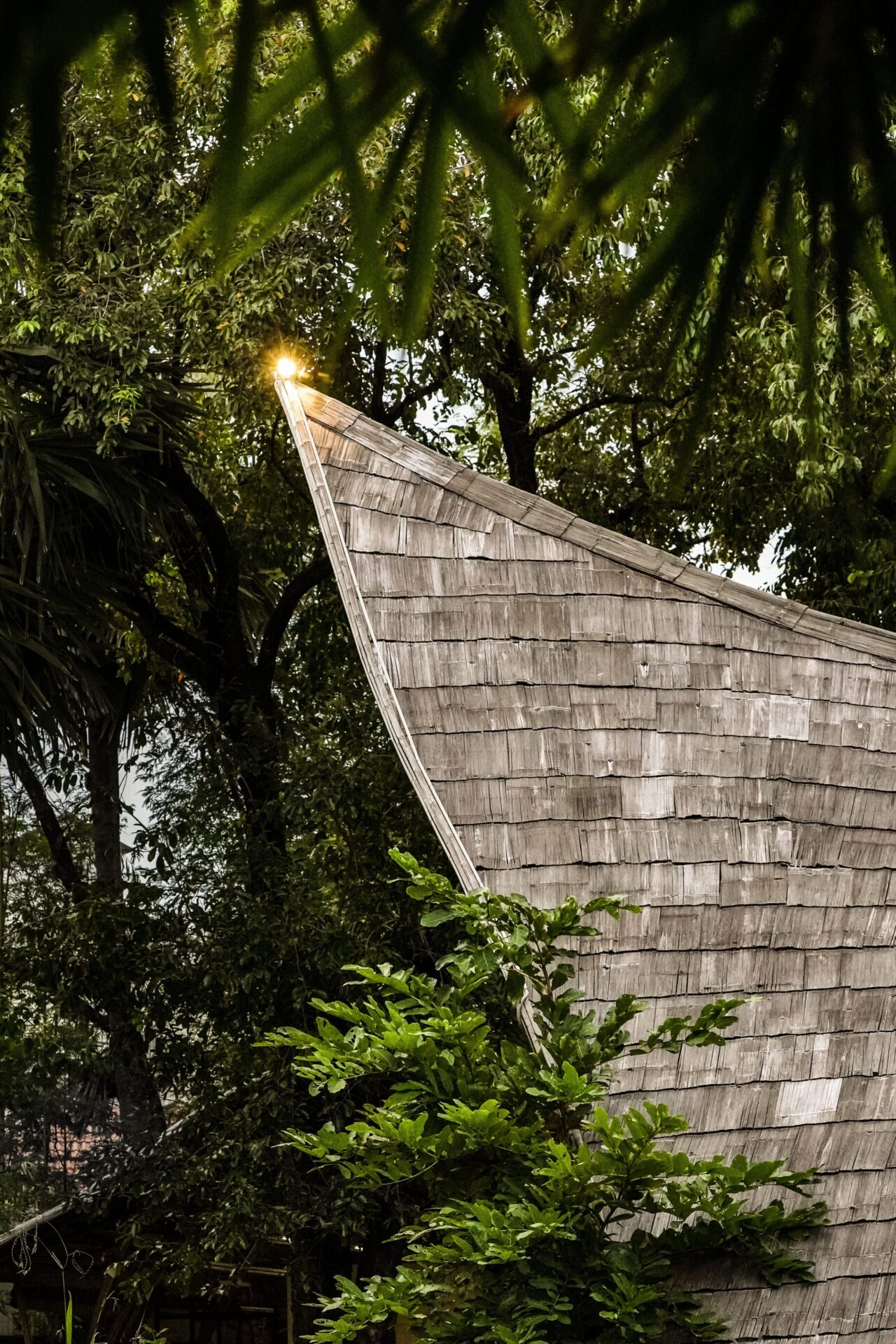 Une partie de l’inspiration vient de leurs structures de stockage à Kampong Cham, proches de Phnom Penh. Nous avons adapté et redessiné ces bâtiments : nous avons changé les dimensions et les proportions, ajusté les formes pour contourner les troncs des arbres existants et intégré des puits de lumière pour réduire l’éclairage artificiel. Certains verront peut-être des références aux constructions indonésiennes, car ce pays est en avance sur l’utilisation du bambou. Mais les formes des maisons traditionnelles du Nord-Est du Cambodge ressemblent beaucoup plus à nos ateliers.