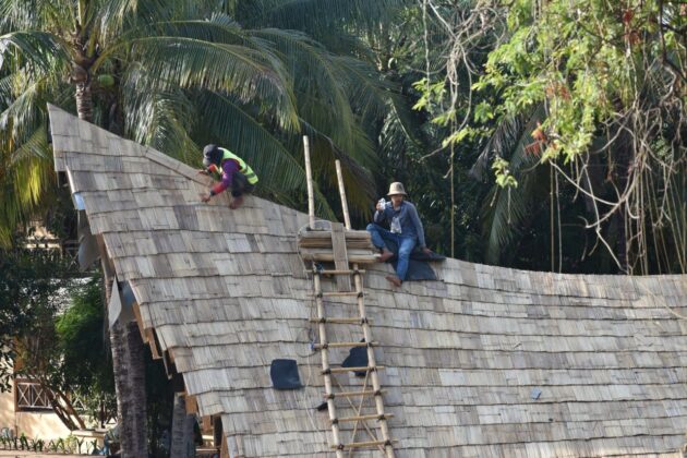 Le bambou « chinois » (qui, malgré son nom, pousse bien en abondance au Cambodge) est utilisé pour les poutres et les colonnes. Le bambou « ping pong », plus fin, sert pour les chevrons. Et le bambou dit « local », qui pousse le long du Mékong et dont la paroi est plus fine, est utilisé ouvert à plat pour les tuiles de toiture.